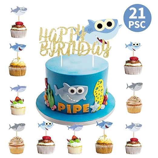 Baby Shark Party Supplies TASIPA 70Pcs Birthday Decorations for kids Includes 1 Big Cake topper 24 Cupcake toppers 4 Shark Balloons with ribbon 1 Happy Birthday Banner 6 shark masks10 Swirl Decorations and 24 shark stickers Cute Shark Theme Birthday Party Supplies for Baby. Baby Shark Cake Toppers Approx. To apply simply peel and stick decals to any smooth flat surface.